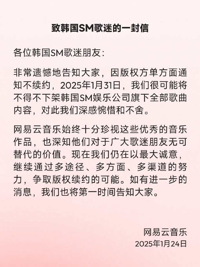 1月24日,网易云音乐发布《致韩国SM歌迷的一封信》,称因版权方SM娱乐单方面通知不续约,平台很可能不得不于1月31日下架SM娱乐公司旗下全部歌曲内容。