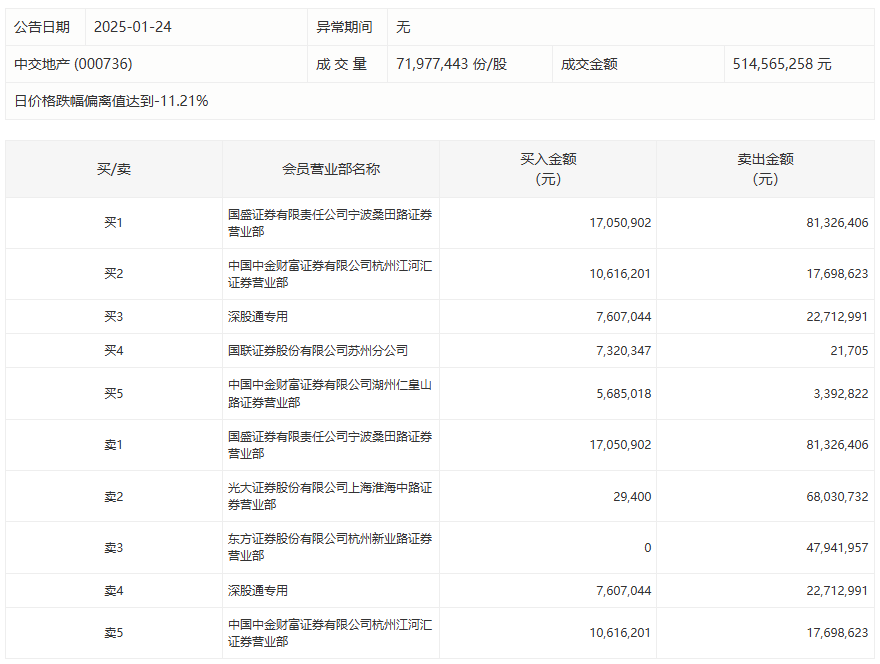 中交地产1月24日跌停,龙虎榜数据显示,上榜营业部席位全天成交2.89亿元,占当日总成交金额比例为56.25%。其中,买入金额为4830.89万元,卖出金额为2.41亿元,合计净卖出1.93亿元。