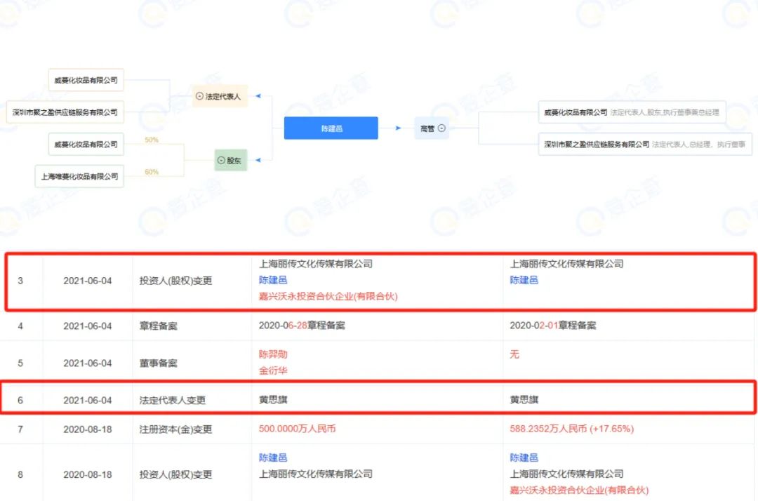 爱企查显示,VENUS MARBLE创始人持股的上海唯蔓化妆品有限公司(注:现已注销),法定代表人系INTO YOU创始人黄思旗。