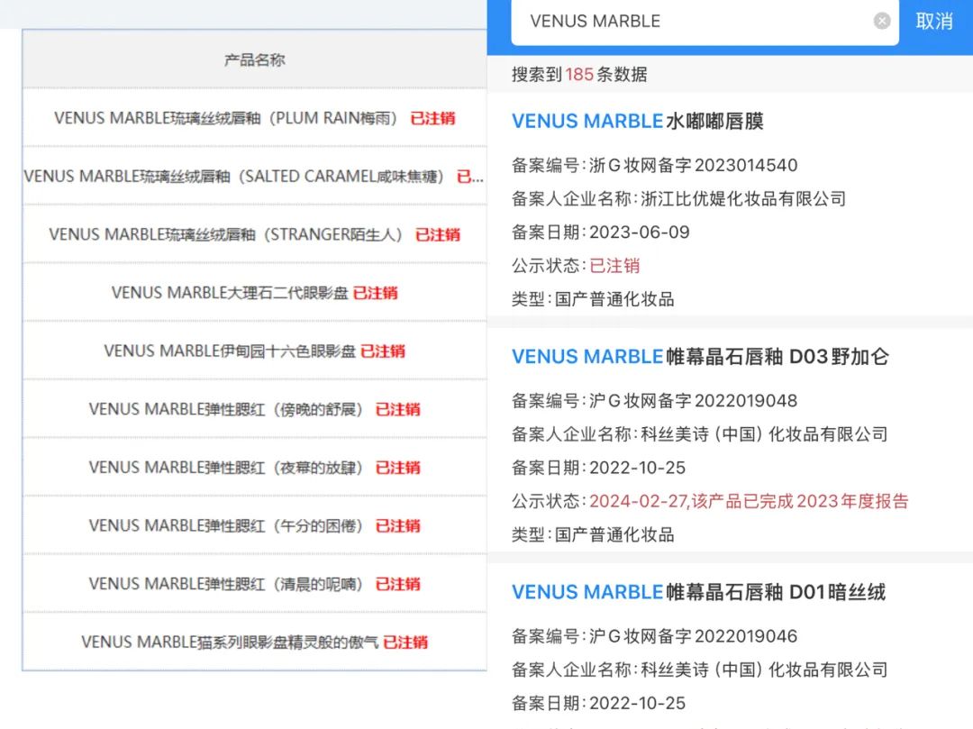 且从国家药监局备案信息查询来看,由威蔓化妆品备案的VENUS MARBLE产品均已注销。