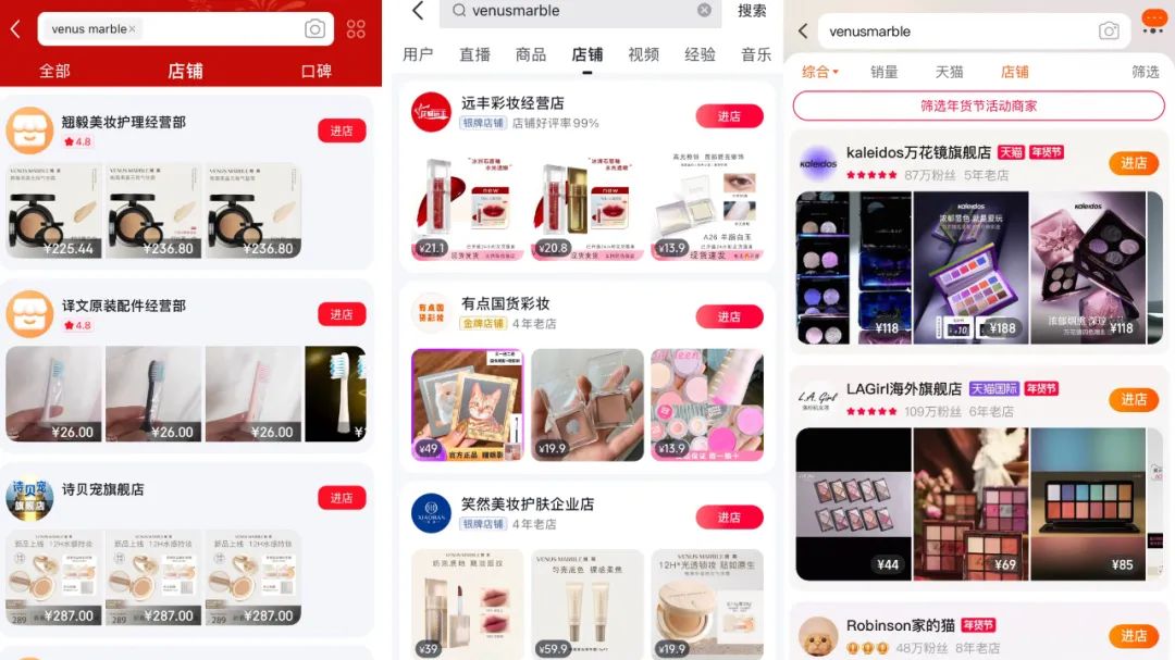 基于上述信息,聚美丽记者也对闭店消息进一步求证,在京东、抖音、天猫上搜索VENUS MARBLE官方旗舰店均显示不见,仅有部分C店在售卖其产品。