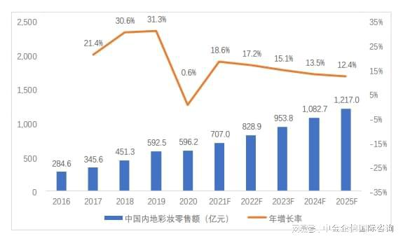 据中金企信统计数据,2017年中国内地彩妆零售额达345.6亿元,年增长率为21.4%;而2017-2019年是国内彩妆市场零售额增速最快的三年,年增速在20%-35%之间。