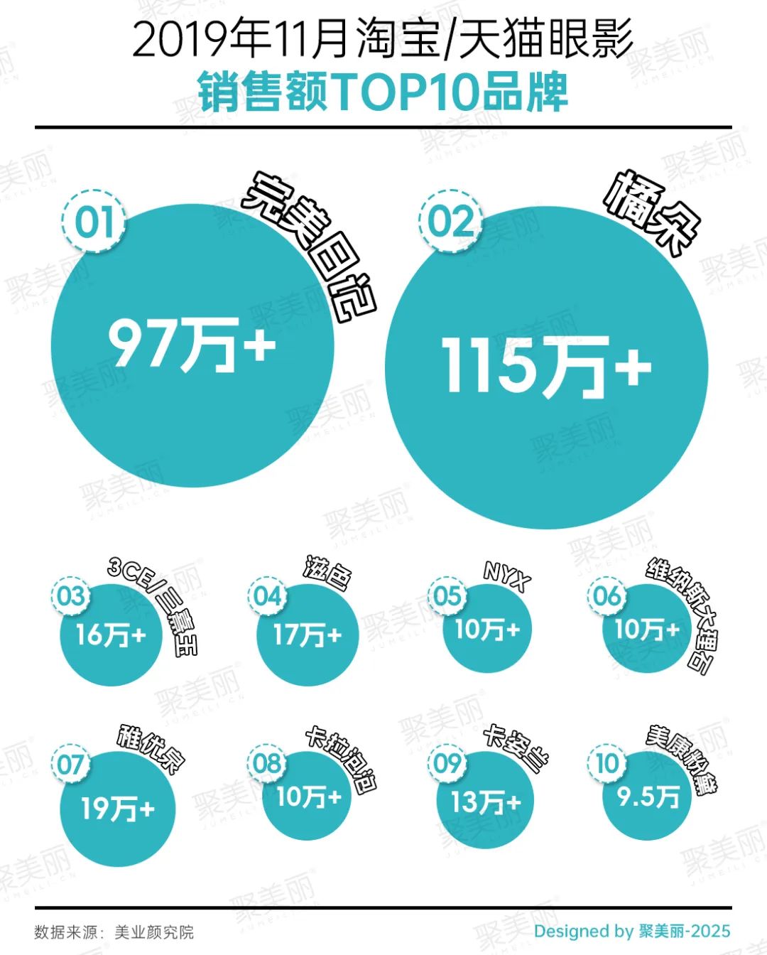 美业颜究院数据显示,2019年11月淘宝/天猫眼影销售额TOP10品牌中,VENUS MARBLE大理石盘销售额下滑到第六名,而在该年完美日记冲到了该榜第一。