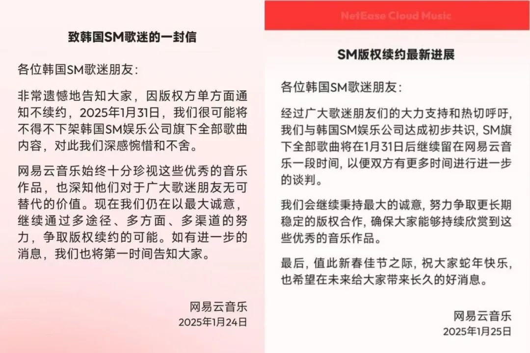 而此时居然天降大瓜。1月24日,网易云音乐发布《致韩国SM歌迷的一封信》,表示SM娱乐单方面通知不续约,平台或将于1月31日下架SM娱乐旗下全部歌曲。次日早八点,网易云再次发布事件进展,表示与SM娱乐达成初步共识,SM旗下全部歌曲将在1月31日后继续留在网易云音乐一段时间,以便进行进一步谈判。