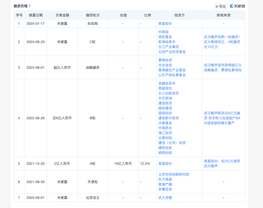值得一提的是,武汉敏声最近的一次融资发生在2024年9月,投资方包括中国互联网投资基金、长江产业集团、骆驼基金等,助推其估值近30亿元。