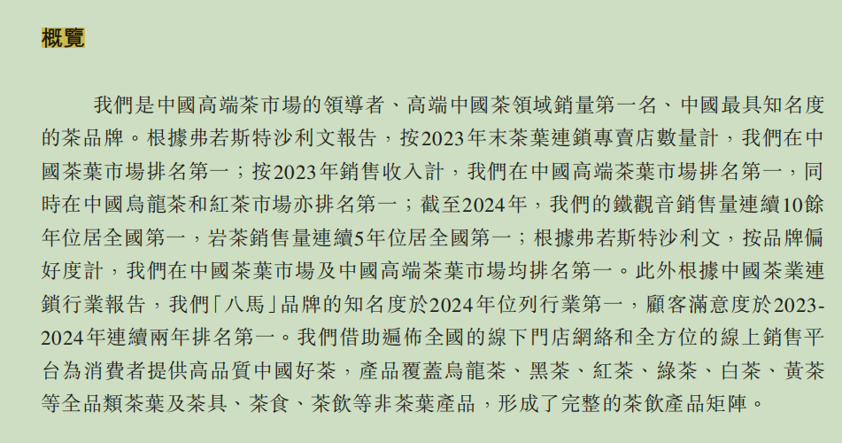 在招股书中,八马茶业仍在强调自身在乌龙茶(铁观音、武夷岩茶等)和红茶市场的领导地位:“截至 2024 年,我们的铁观音销售量连续10余年位居全国第一,岩茶销售量连续5年位居全国第一。”