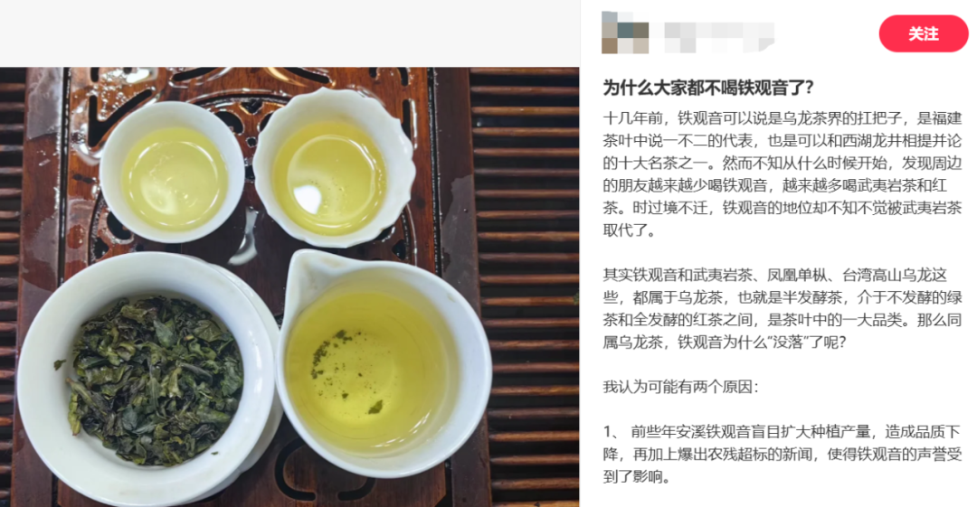 有资深茶友表示,身边喝铁观音的朋友越来越少,现在大家更喜欢温润养胃的茶种,比如普洱、岩茶,“以清香为主的铁观音,论鲜爽细腻不如绿茶,论醇厚温润不如岩茶和红茶,失去了自身的特色,一时也变不回去了。”