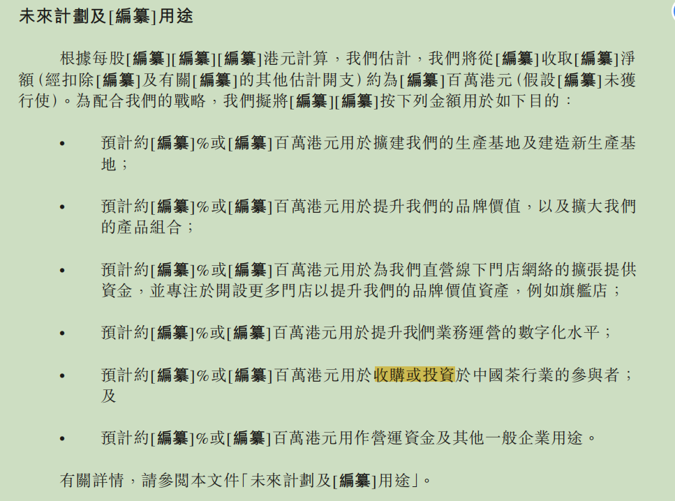 除了联姻,八马茶业还瞄准了茶叶行业的其他企业。根据招股书披露,八马茶业此次IPO募集资金将主要用于建造新生产基地、提升品牌价值并扩大产品组合、为直营线下门店网络的扩张提供资金等方面;除此之外,最新的招股书还新增了一项资金用途,即“收购或投资在中国茶行业的参与者”。
