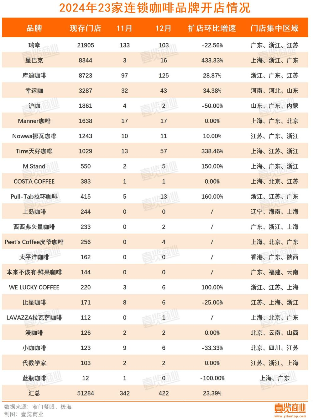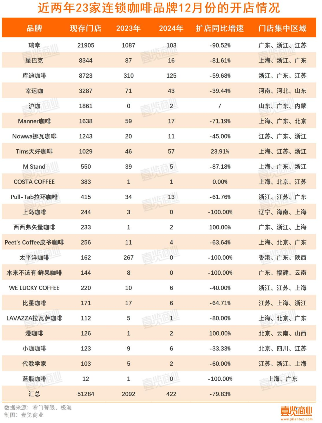 12月,壹览商业长期跟踪的23家连锁咖啡品牌新开门店422家,环比增加23%,同比下降79.83%,门店总数达到51284家。