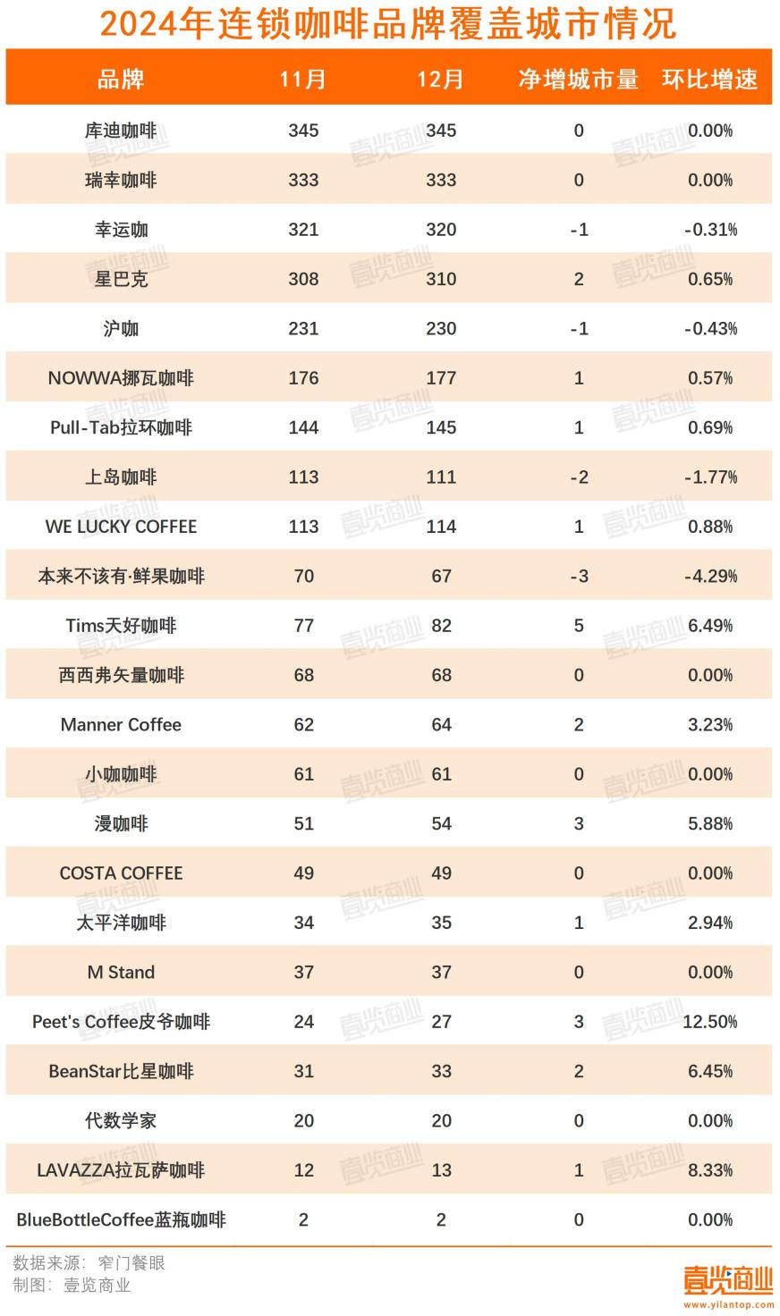 其中,库迪咖啡12月开出125家门店,开店量位居行业第一,其次是瑞幸咖啡,12月开出103家门店;Tims天好咖啡则在元旦期间开出57家新店,并首次入驻衡水、宣城、滁州、衢州等城市。太平洋咖啡连续3个月未曾开出新店,本来不该有·鲜果咖啡2024年下半年未曾有新店开业。