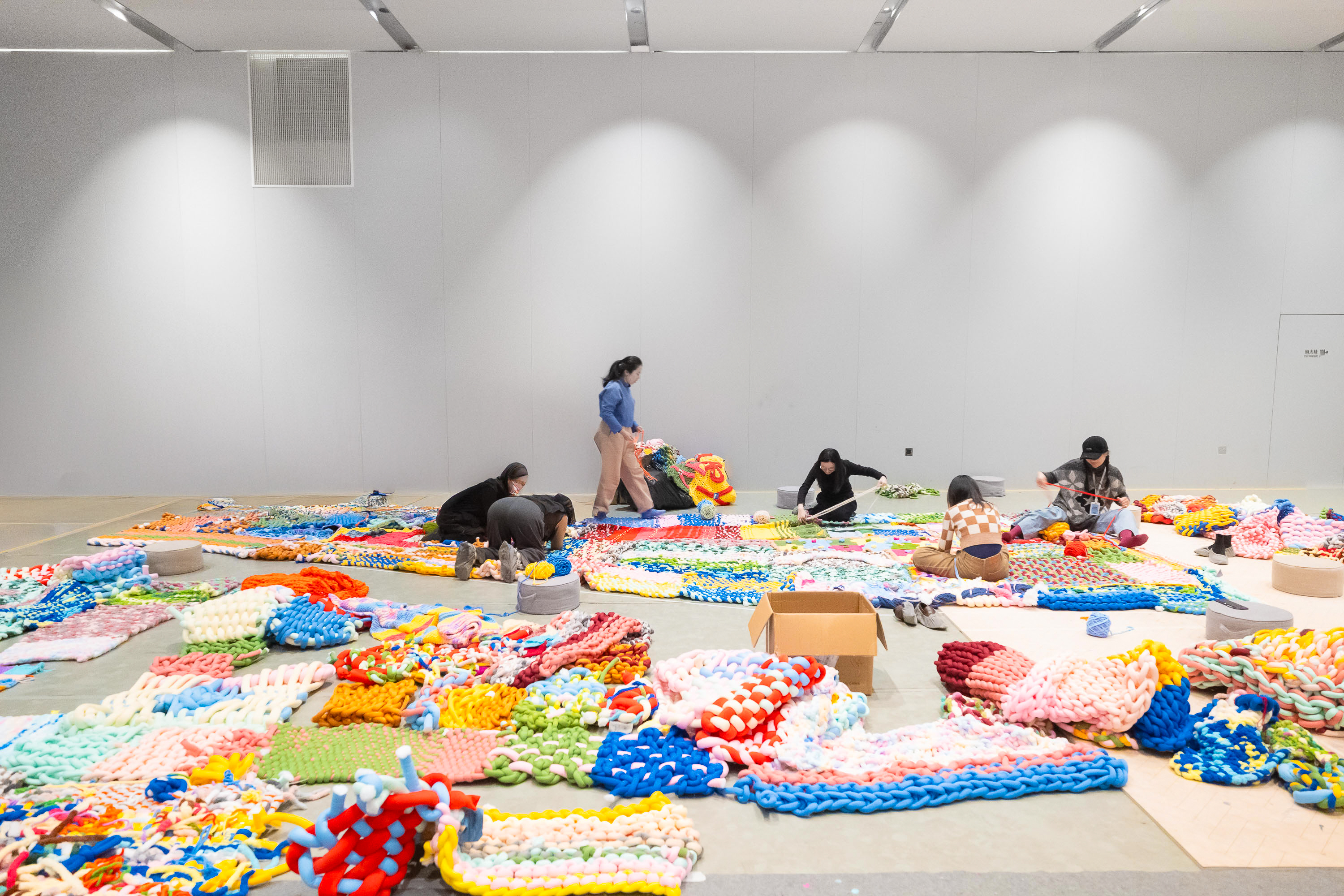目前,“线线相连”第二阶段编织计划正在进行中,以期更多人共同延展这件艺术作品的生命力。西岸美术馆还在中庭安放了一台编织机,面向公众的编织工作坊和分享会也将陆续开展。