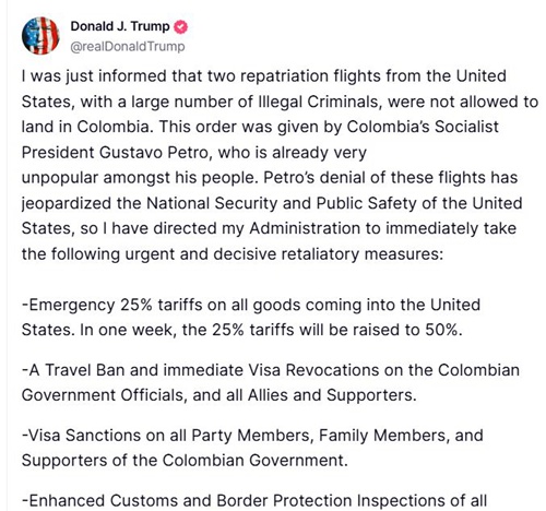 特朗普谴责,佩特罗的行为威胁到美国的国家安全和公共安全。鉴于此,美国政府将立刻对哥伦比亚采取报复措施:对所有从哥伦比亚进口到美国的商品征收25%的紧急关税,一周后将提高至50%。