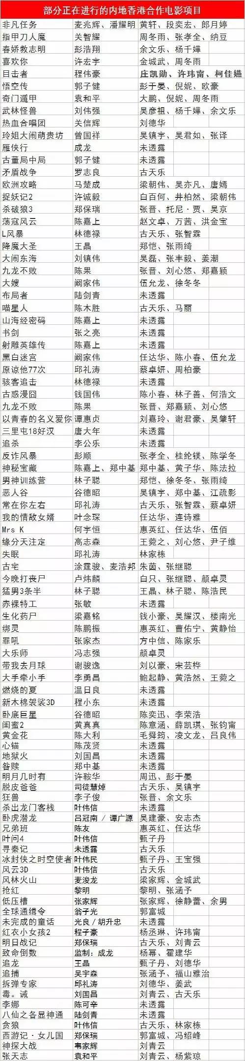 在博纳的片单计划上叶伟信的《贪狼》,林超贤的《刀峰·红海行动》,许鞍华的《明月几时有》,郑保瑞的《杀破狼3》,麦兆辉、庄文强的《无双》,尔冬升的《窃听风云4》,刘伟强的《建军大业》和《武林怪兽》,王晶的《追龙》等等,内地题材加上香港导演已经成为了博纳影业投资内地电影的标配。