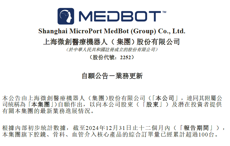 1月24日,微创机器人(2252.HK)披露业务更新公告,公司旗下腔镜、骨科、血管介入核心产品的综合订单量已累计超过100台。