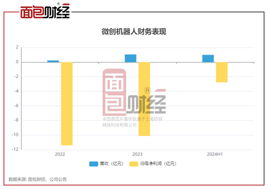 由于营收规模较小且费用前置,微创机器人2022年、2023年的归母净利润分别为-11.4亿元、-10.12亿元。2024年上半年,公司亏损明显收窄,归母净亏损约2.77亿元。