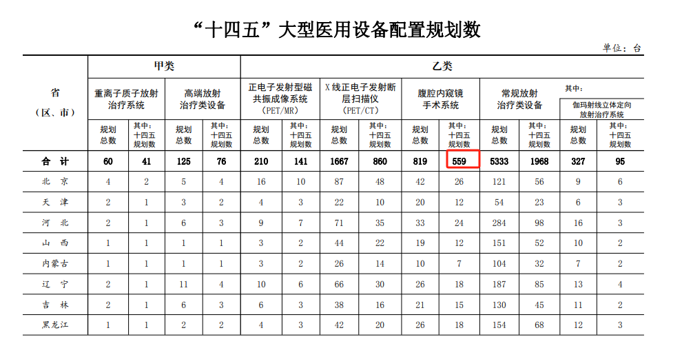 2023年6月,国家卫健委发布“十四五”大型医用设备配置规划。规划显示,“十四五”期间腹腔内窥镜手术系统规划数达到559台,较“十三五”期间规划数大幅增长。部分观点认为2025年国内腹腔内窥镜手术系统将加速放量。