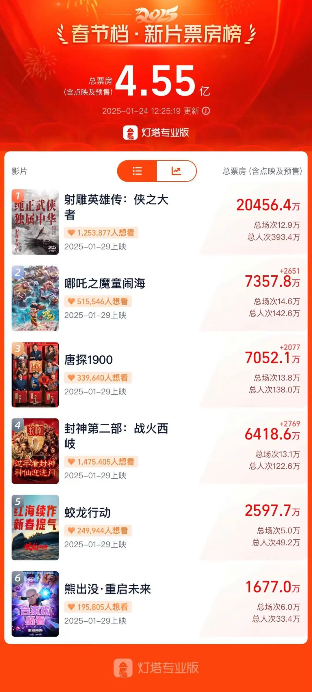但不论如何,2025年春节档将无疑是重要的信心节点。如果票房能一飞冲天,观众回归影院,将有望调动起从业者更有信心排片,也会带起投资人的热情,继续为电影投入。