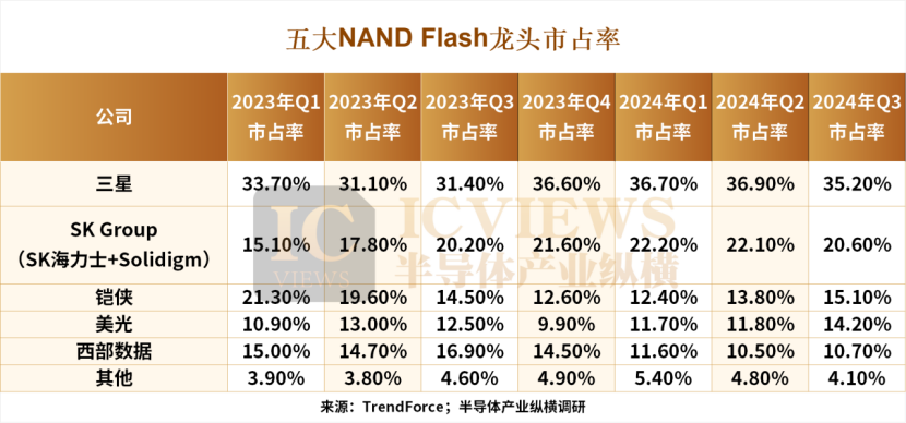 值得关注的是,近两年来,NAND市场的波动不仅限于价格,各龙头企业的市场占比也在发生变化。