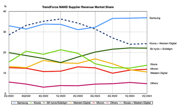 上图可见,自2023年初以来,SK海力士集团的市场份额一直在稳步增长,三星从2023年第二季度也开始增加了其市场份额。与此相反,铠侠、美光和西部数据的市场份额有所下降,尤其是铠侠。考虑到铠侠和西部数据之间存在NAND制造合资关系,将两者的市场份额合并计算,发现SK集团市场份额的增加与他们联合市场份额的显著下降几乎同步。