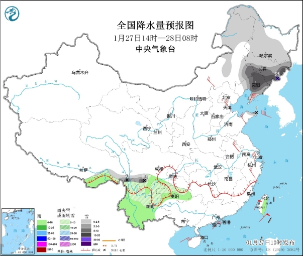 1月27日14时至28日08时,内蒙古东部、东北地区大部、四川南部、贵州中北部、云南东北部等地部分地区有小到中雪或雨夹雪,内蒙古东南部、辽宁中东部、吉林南部和东部、山东半岛北部、四川南部等地部分地区有大到暴雪,吉林东南部局地有大暴雪(20~26毫米)。