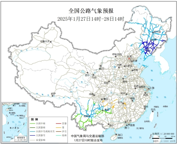 27日14时至28日14时,内蒙古东部、东北地区大部、四川南部、贵州中北部、云南北部等地部分道路受降雪或雨夹雪影响,发生道路湿滑、结冰、积雪的风险较高;四川东南部、贵州南部、云南西南部等地部分道路受降雨影响,发生道路湿滑的风险较高;重庆西南部、湖南东部和西北部、贵州东北部等地局地道路需防范低能见度对交通出行的影响。