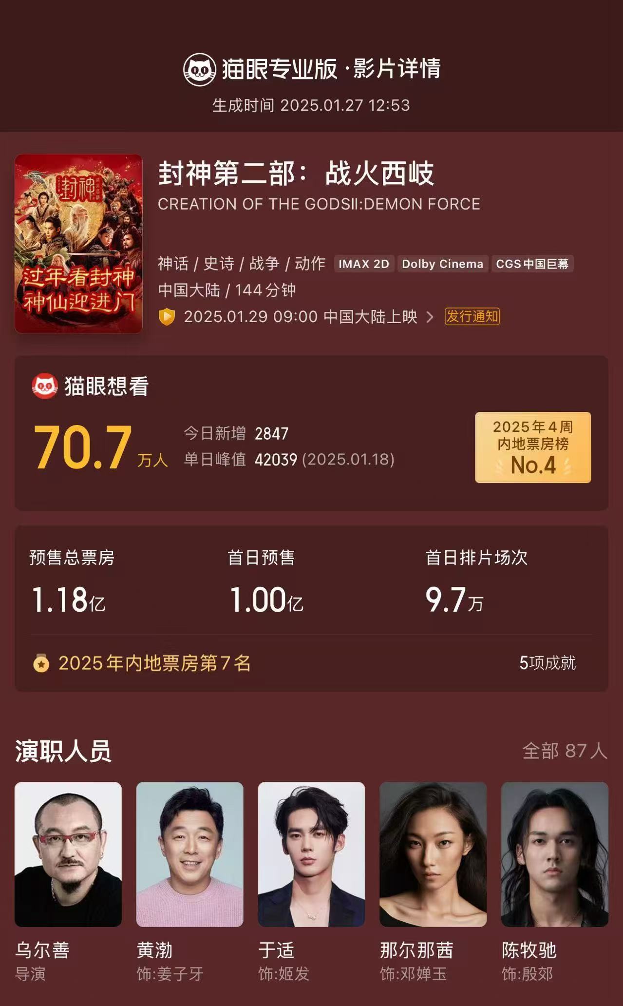 电影《封神第二部:战火西岐》大年初一预售票房破亿