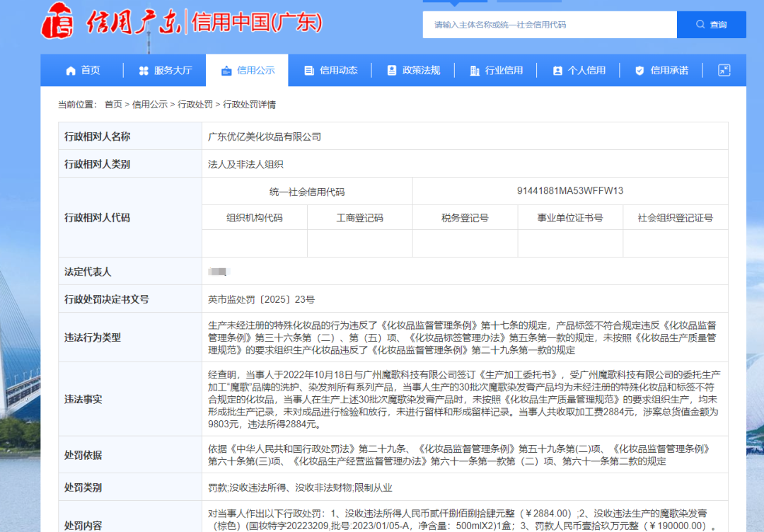 根据信用广东披露的行政处罚详情,2022年10月18日,优亿美与广州魔歌科技有限公司(下称“魔歌科技”)签订了《生产加工委托书》,负责为后者生产“魔歌”品牌洗护和染发剂系列产品。然而,优亿美生产的30批次魔歌染发膏被发现是未经注册的特殊化妆品,且产品标签不符合相关规定。