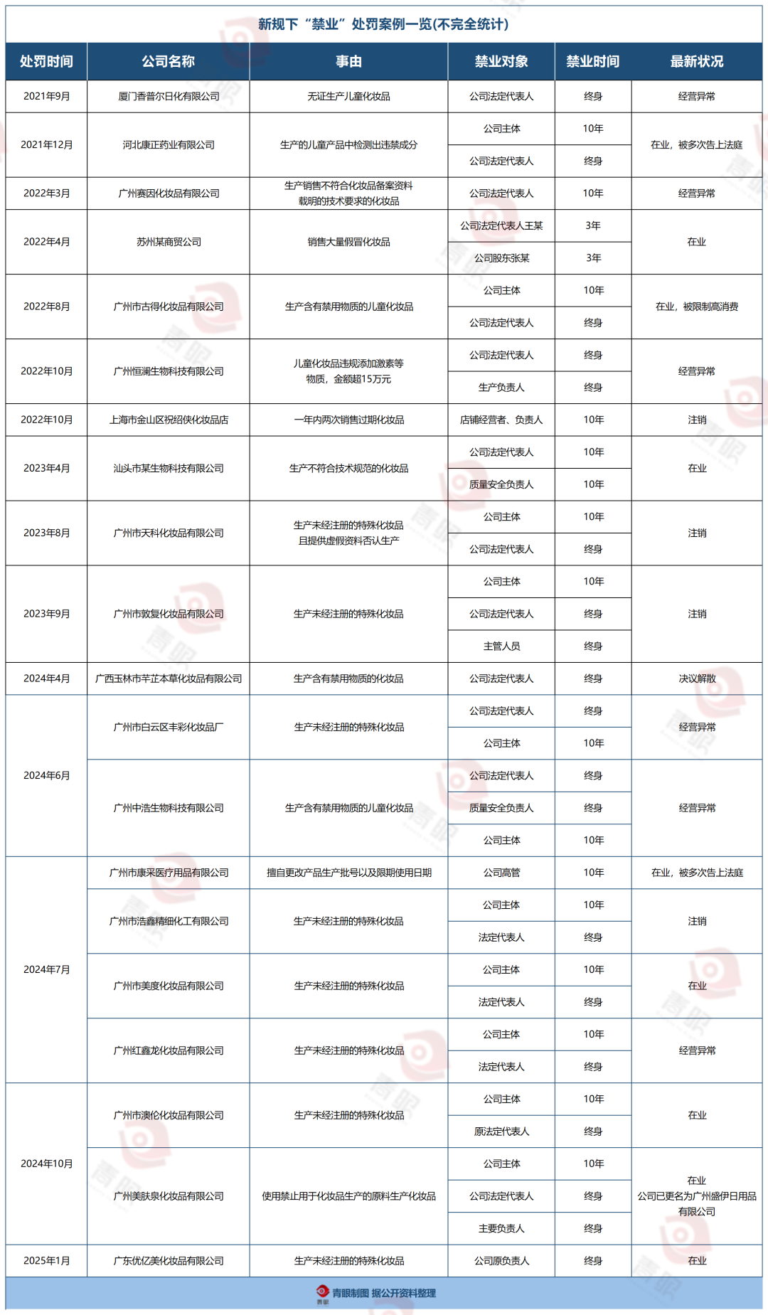 据青眼不完全统计,自2021年以来,各地监管部门共开出了37张禁业罚单,涉及20家企业,累计有26名从业者被禁业,包括法定代表人、股东、质量安全负责人等,其中有19人遭到“终身禁业”。