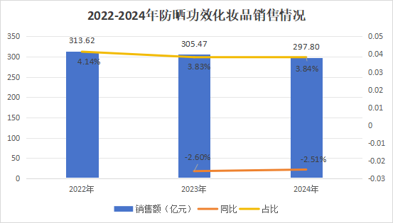 据青眼情报数据显示,早在2022年,中国防晒化妆品市场规模就突破300亿大关,国际品牌与本土品牌争相布局防晒赛道,部分品牌强势占据市场份额,形成“一超多强”的市场格局。2024年,防晒化妆品市场规模为297.80亿元,虽相较2023年同比下降2.51%,但3.84%的市场份额仍保持0.01%增长。
