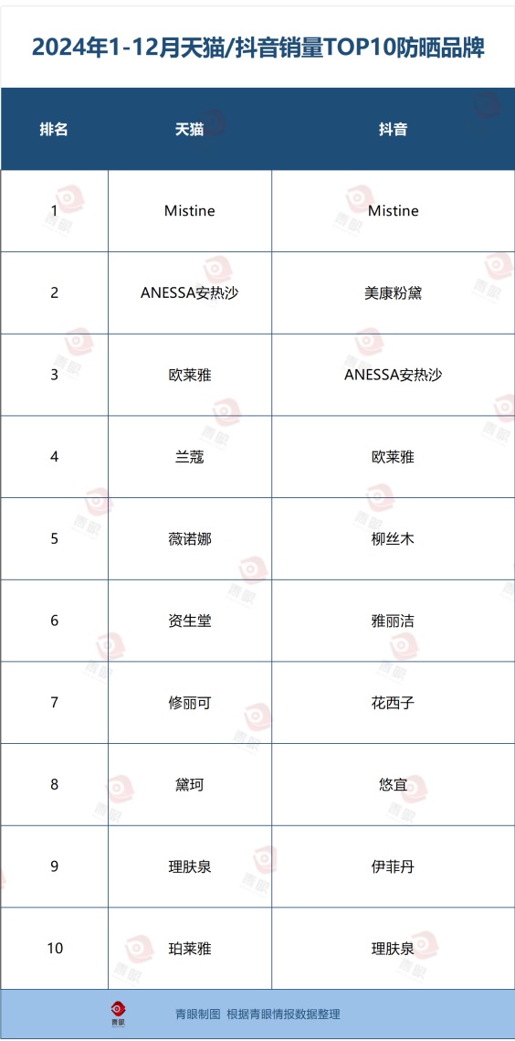 据青眼情报数据,在2024年各主流渠道防晒功效GMV前20的品牌中,Mistine以多平台破10%的市场份额稳居淘天、抖音、快手的第一名,京东第一名为ANESSA安热沙。此外,2024年1—12月,在淘天和抖音平台,TOP10防晒品牌市占率均超40%,国货品牌规模占比约4成。