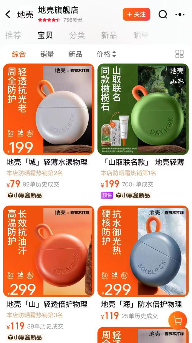 2024年底,广州环亚推出的专业防晒品牌“地壳”,就为国货防晒赛道带来了新生力量。据了解,地壳目前已备案8款新品,并在天猫官方旗舰店上新5款产品,产品单价在79~199元不等,内容场景以户外+轻户外为主。