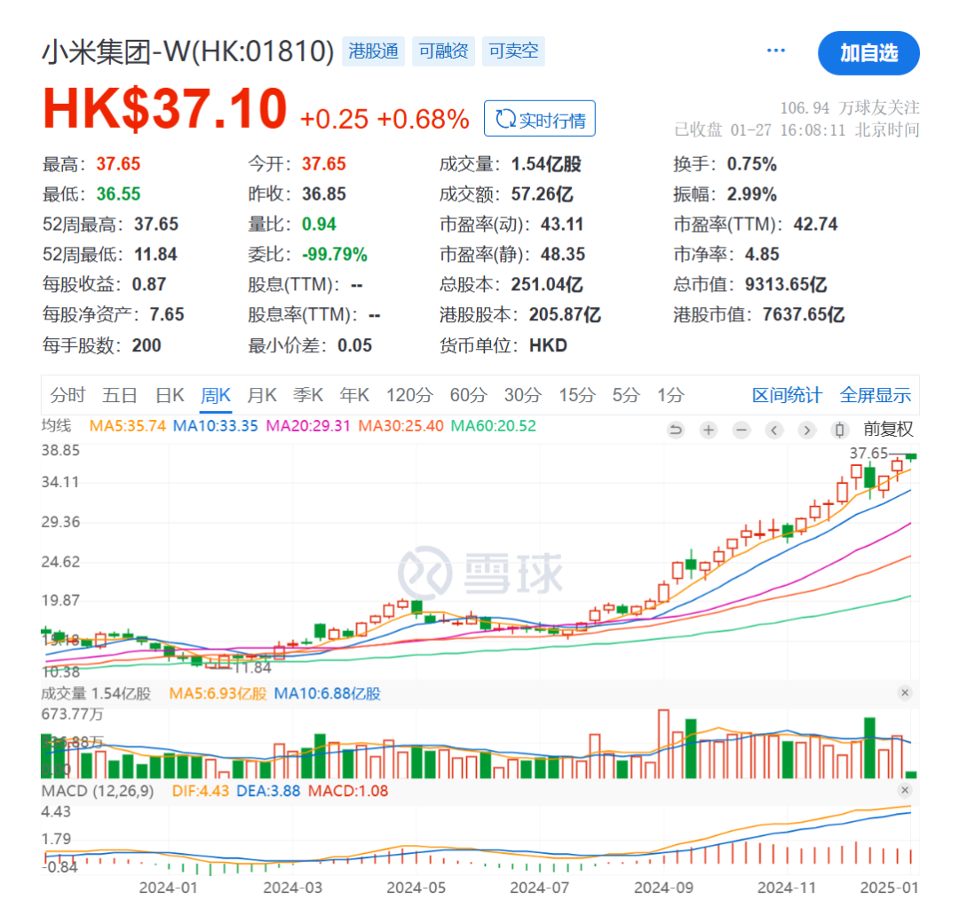 2024年初,小米集团股价为14.9港元 ,而截至12月底,集团股价已攀升至34.5港元,全年涨幅超过100%,远远跑赢恒生科技指数年内18.7%的涨幅。