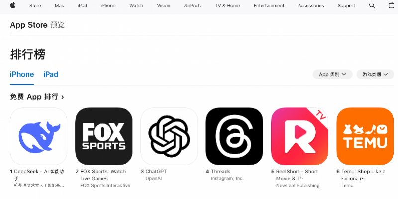DeepSeek最先引发热潮是在美国,其更是在近期一举反超ChatGPT,一举登顶美区苹果应用商店免费App排行第一,整个硅谷和AI界都对这款产品发出了极强好奇心。
