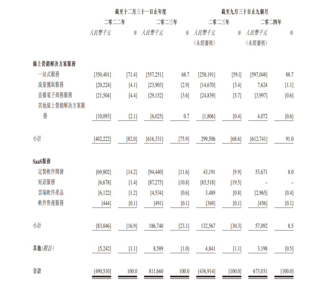 从收入构成来看,其收入主要来自包括一站式服务、流量获取服务、直播电子商务服务以及其他在线营销解决方案服务,包括综合会议服务、视频制作服务及电子商务业务服务在内的在线营销解决方案服务业务;包括云端软件供应、短讯服务、定制软件开发及软件售后服务在内的SaaS服务业务;以及社交媒体推广服务、劳务分包服务及硬件销售等其他业务。