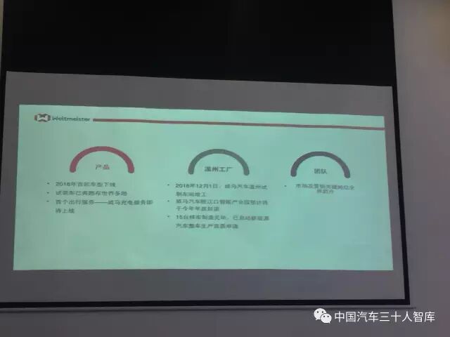 3月29日,在威马汽车的媒体沟通会上,其战略规划副总裁陆斌公开几个关键信息:目前威马的15辆样车已在温州工厂制造完毕,威马正启动新能源汽车整车生产资质申请;首款量产车预计会在2018年下旬下线。