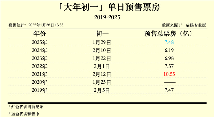 据猫眼专业版数据,截至1月28日13时33分,2025年大年初一预售票房突破7.48亿元,超2019年预售票房成绩,进入影史大年初一预售票房榜前三。