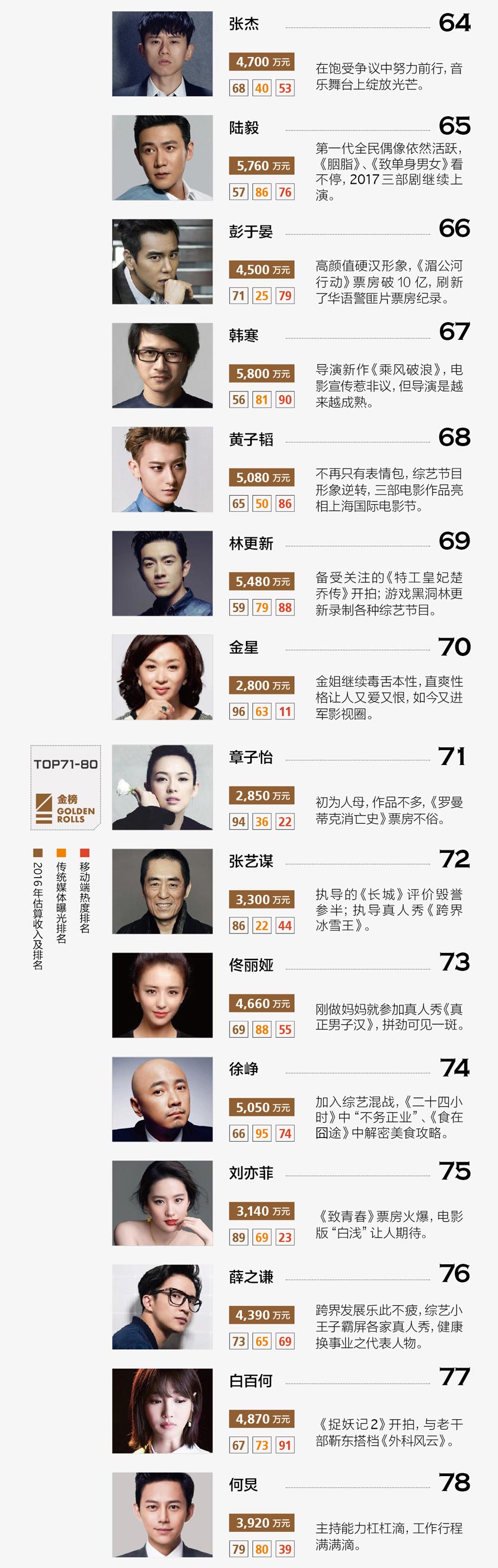 另外,TFBOYS(第52名)是本次榜单中的唯一一个组合。出道时还只是初中生的他们,现在已渐渐长大,综艺活动中露脸颇多,已连续2年登上了春晚的舞台。三个人在歌手的身份下慢慢试水影视剧,2016年接拍了《我们的少年时代》和《超少年密码》两部电视剧,成绩如何还将拭目以待。