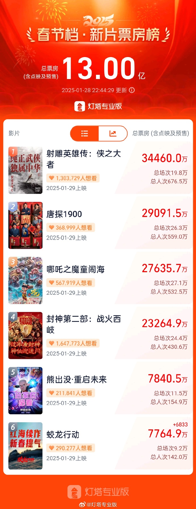 据灯塔专业版,截至1月28日22时44分,2025年春节档上映新片预售总票房突破13亿。