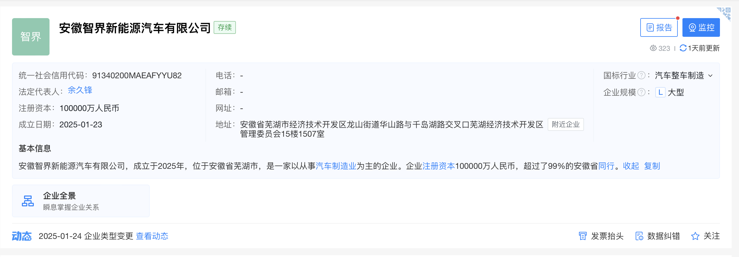 安徽智界新能源汽车有限公司于1月23日在芜湖成立,奇瑞汽车股份有限公司作为该公司唯一股东,全资控股安徽智界新能源汽车有限公司。