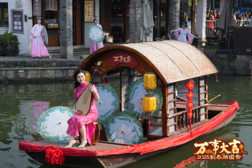 本期《万事大吉-2025新春游园会》新年祝福篇落地江南水乡绍兴柯桥古镇,这是充满诗意的水乡风情,白墙黑瓦,枕河人家,每一处风景都诉说着千年的故事,为节目增添了独特的文化魅力。