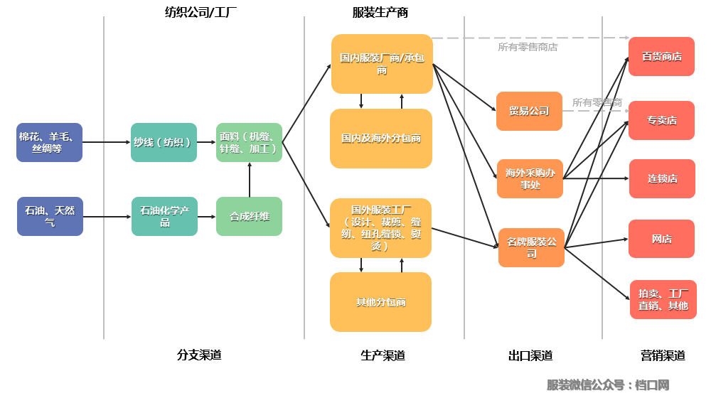 服装行业价值链属于消费者驱动型,消费者决定以何种价格生产何种产品。通常来说,大型外贸服装公司将生产外包予最具价格竞争力的发展中国家分包生产渠道。外贸服装公司包括已开发市场的零售商及品牌拥有人。这类服装公司通常控制着服装价值链中最具价值的活动(如设计、营销及销售)。服装供应链管理公司提供的主要增值服务包括:
