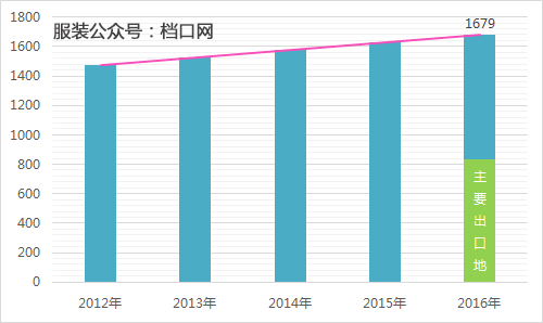 根据联合国统计数据库数据(UNSD),中国2016年取得服装出口总值1679亿美元,2012年-2016年复合年增长率为3.2%。欧盟、美国、日本及东南亚均为服装的主要出口目的地,占2016年中国服装出口总值的50%以上。