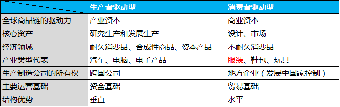 反观全球市场,早期产业与商业的资本运作分为两大类型。一类是生产者驱动的产品链,另一类是消费者驱动的产品链。如下图所示,