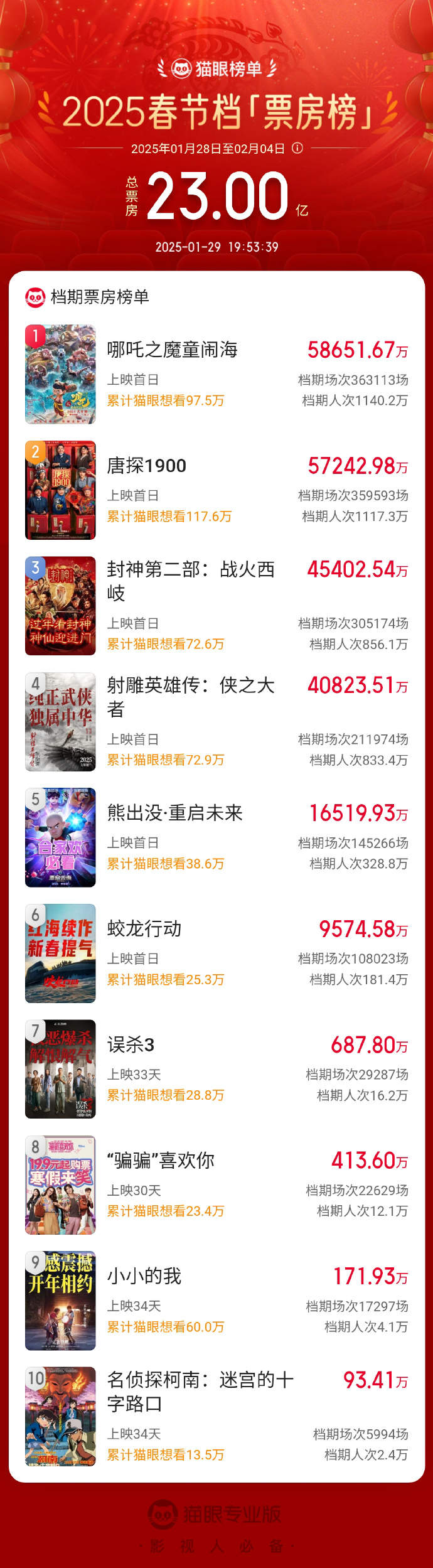 据猫眼专业版数据,1月29日19时53分2025春节档总票房(含预售)破23亿!《哪吒之魔童闹海》《唐探1900》《封神第二部:战火西岐》分列春节档票房榜前三位。
