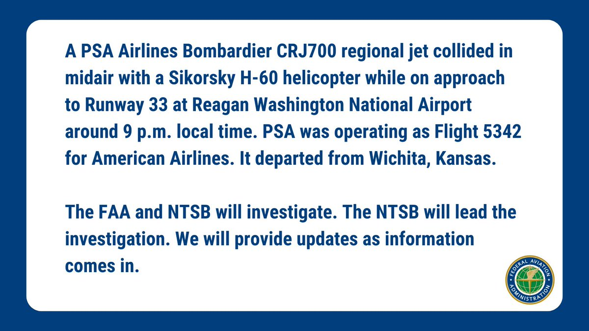 美国联邦航空局发布声明称,当地时间1月29日晚9点左右,一架PSA航空公司的庞巴迪CRJ700支线喷气式飞机在里根华盛顿国家机场与一架西科斯基H-60直升机(即“黑鹰”直升机)在空中相撞。PSA当时正在执飞美国航空公司的5342号航班。该航班从堪萨斯州威奇托起飞。美国航空也证实,由PSA航空公司执飞的美鹰航空5342号航班从堪萨斯州飞往华盛顿里根国家机场时发生事故。