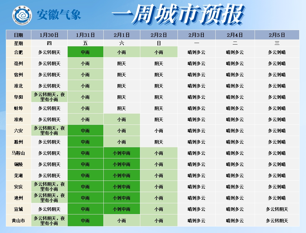 2月1日(初四):全省阴天。沿淮淮河以南有小雨,部分地区中雨,其中大别山区部分地区有小雨转雨夹雪或雪。