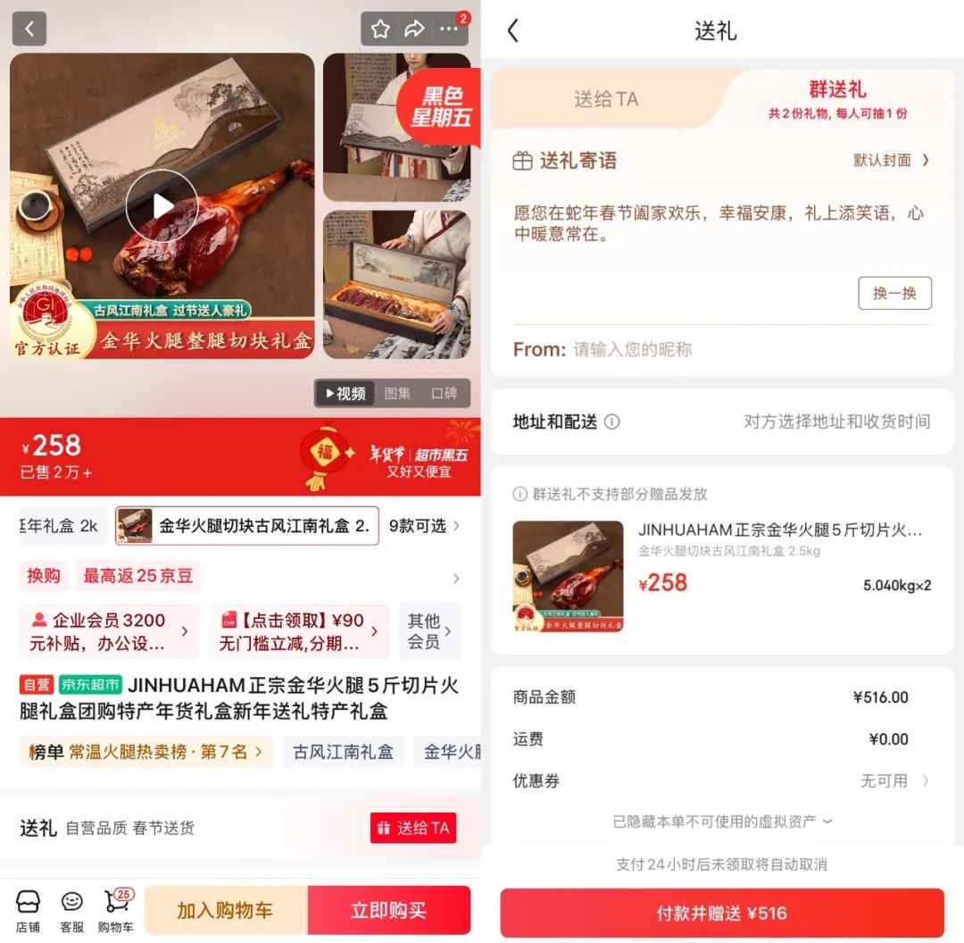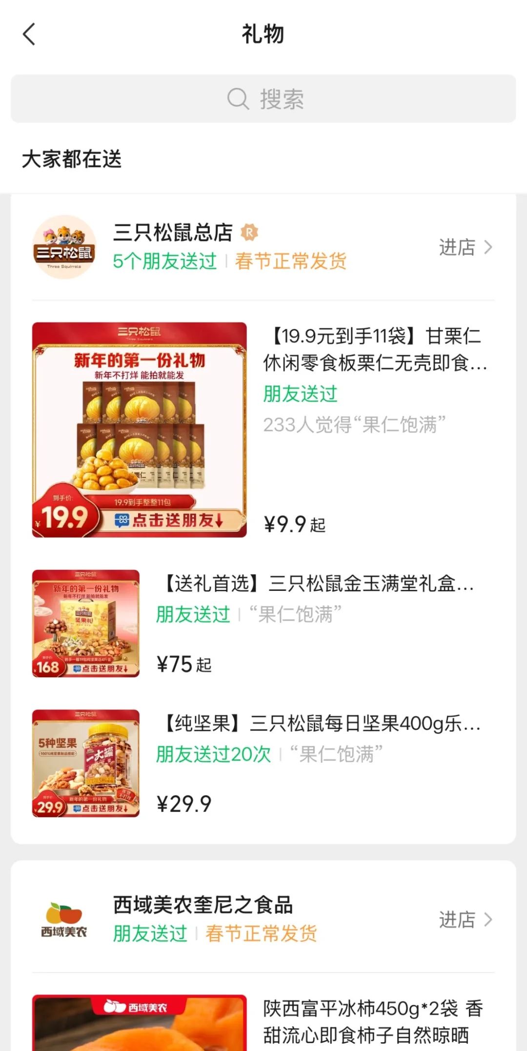 但在平台和商家层面,送礼物在年前就已经「爆」了。微信上线送礼物之后,淘宝、京东等电商平台,美团等本地平台,先后上线或更新送礼相关功能。许多商家也紧急上线微信小店,春节期间正常发货服务的商家,还能在「订单与卡包」页的「礼物」入口等处获得更多公域流量。