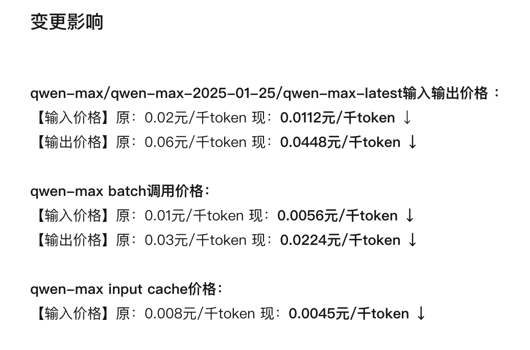 1月30日,阿里云发布百炼qwen-max系列模型价格调整通知,qwen-max、qwen-max-2025-01-25、qwen-max-latest三款模型输入输出价格调整,qwen-max batch和cache同步降价。