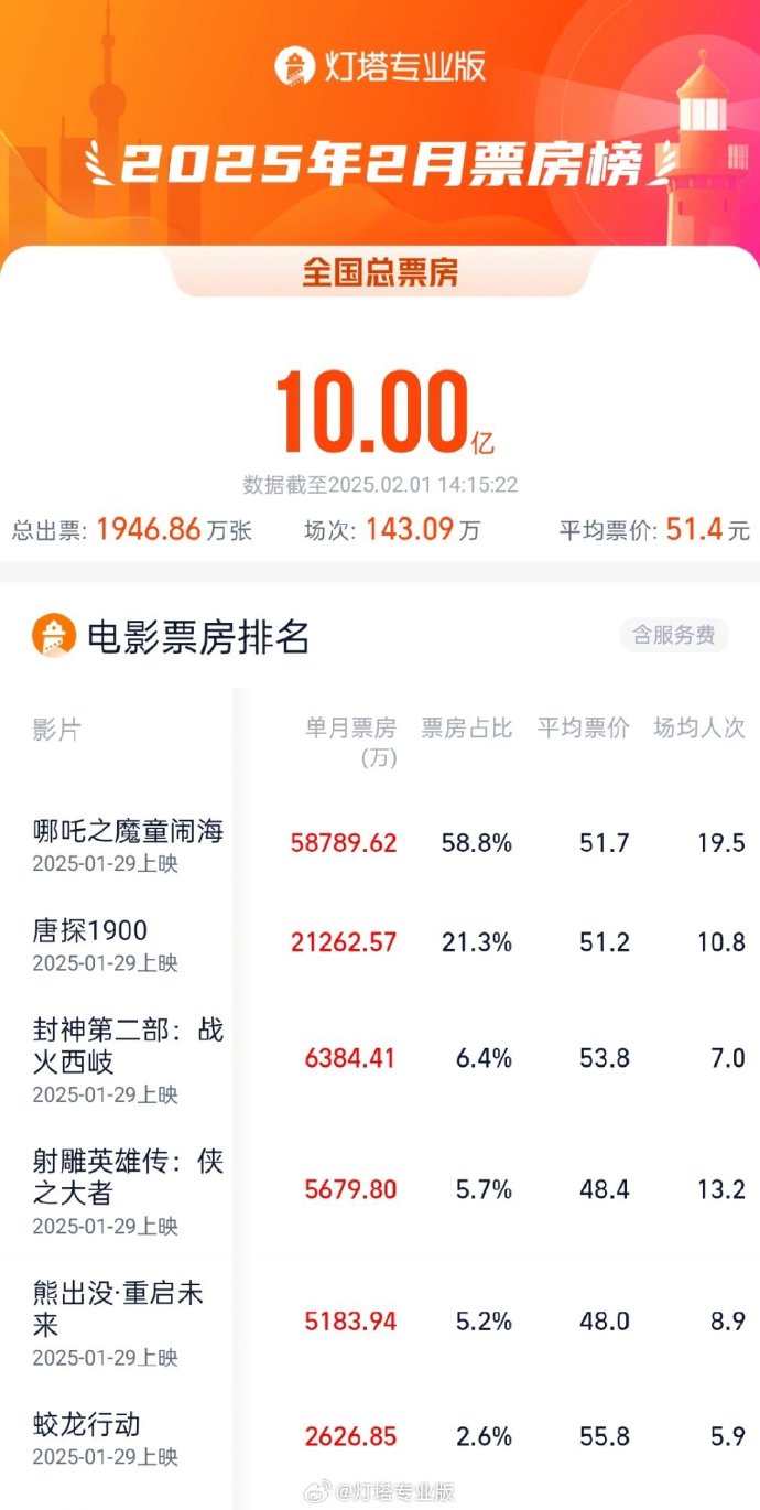 据灯塔专业版,截至2月1日14时15分,2025年2月票房(含预售)已突破10亿。