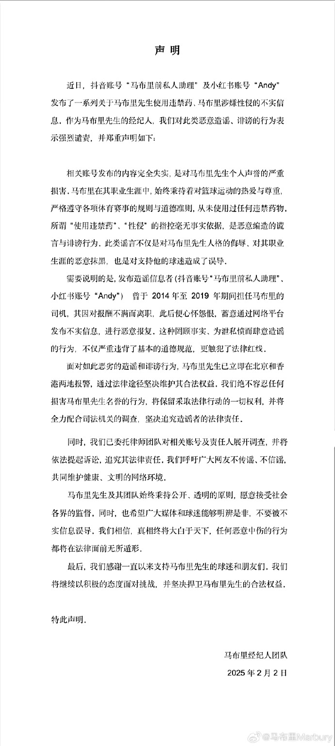 针对近日网络上CBA知名外援马布里使用过违禁药物,且马布里的个人体能师还给孙杨提供过违禁药物的流言,孙杨2月2日发布声明称,从来没有和马布里、体能师及其助理团队单独接触过,将追究一切造谣、诽谤者的法律责任。马布里随后也在社交媒体发表声明称,相关账号发布的内容完全失实,目前马布里已在香港和北京报警,并将提起诉讼,追究其法律责任。